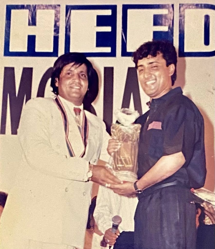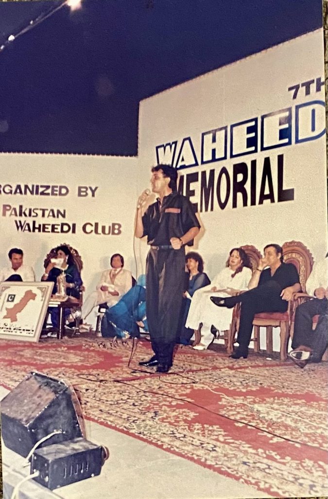 نیچے دی گئیں تین تصویروں میں سے ایک میں آپ یہ منظر دیکھ رہے ہوں گے، پاکستان فلم انڈسٹری کے لیجنڈ فلمسٹارز جن میں محمد علی، زیبا، ریما، غلام محی الدین، روبی نیازی، محسن حسن خان، جاوید شیخ، عمر شریف، سلمی مراد(بیگم وحید مراد) اور بہروز سبزواری نظر آرہے ہیں، مذکورہ تصاویر 1992 میں ہونے والے وحید مراد ایوارڈز کی تقریب کی ہیں جو کراچی کے ریکس آڈیٹوریم میں منعقد ہوا تھا۔ یہ تقریب عیدالاضحیٰ کے دو ہفتے بعد منعقد ہوئی تھی۔ تقریب سے دو دن پہلے ہی سپر ہٹ اسٹیج ڈراما “گڈ لک معین اختر” اپنے 20 کامیاب شو مکمل کرکے ختم ہوا تھا جس میں معین اختر صاحب، روبی نیازی میں (حنیف راجا) اور دیگر مشہور کاسٹ تھی،وحیدی ایوارڈ کیلۓ اس اسٹیج ڈرامے سے نامزد معین بھائی، روبی نیازی، ڈائریکٹر سید فرقان حیدر صاحب اور میں ہوۓ تھے۔ اس تقریب میں میرے حوالے سے جو واقعہ رونما ہوا اس سے اس بات کی تصدیق ہوگئی کہ ذہانت اپنی جگہ اہم سہی لیکن تجربے کا کوئی نعم البدل نہیں ہے۔ 1990 تا 1995 میرے فنی کیریئر کے پنپنے کے اہم سال تھے۔ہوا کچھ یوں کہ تجربہ کم اور جوش زیادہ تھا کم عمری میں الثر ایسا ہی ہوتا ہے۔نیچے موجو د تصاویر میں سے ایک میں ،میں عمر بھائی (عمر شریف) سے ایوارڈ لے رہا ہوں ،مجھے ایوارڈ دیے جانے سے پہلے میری ا اؤنسمنٹ ہوئی اسٹینڈاپ کامیڈی پرفارمنس کے لیے میں نے جم کر کامیڈی کی ہال آڈینس سے کھچا کھچ بھرا ہوا تھا کوئی نشست خالی نہیں تھی حتی کے لوگ سیڑھیوں پر براجمان تھے میری پرفارمنس کو میرے عقب میں تشریف فرما فلم اسٹار محمد علی صاحب کے بلند قہقہے نہایت جلا و جوش بخش رہے تھے۔بعد از پرفارمنس میرے ایوارڈ کی اناؤنسمنٹ ہوئی ،کیٹیگری تھی سال 1991 کے بہترین اسٹینڈاپ کامیڈین اور اداکار کی لوگوں نے بڑی فراخ دلی سے دوبارہ بھرپور تالیوں سے استقبال کیا مجھے ایوارڈ دینے کے لیے بیگم وحید مراد یعنی سلمی مراد صاحبہ سے درخواست کی گئی وہ اٹھ کر آئیں اور مجھے دینے کیلۓ ایوارڈ تھام لیا میں نے عمر بھائی (عمر شریف ) کی محبت و عقیدت میں فرمائش کردی کہ میں یہ ایورڈ عمر شریف صاحب کے ہاتھوں لینا چاہتا ہوں، صورت حال عجیب سی ہوگئی ،سلمی صاحبہ میرا ایوارڈ عمر بھائی کو تھما کر واپس اپنی نشست پر بیٹھ گئیں بہر حال عمر بھائی نے مجھے ایوارڈ دیا اورمیرے کام کو بہت سراہا ہال میں پھر تالیوں کا شور ابھرا اور میں ایوارڈ ملنے کی مبارک بادیں سمیٹتا ہوا دوسرے کسی شو میں پرفارمنس کے لیے چلا گیا۔